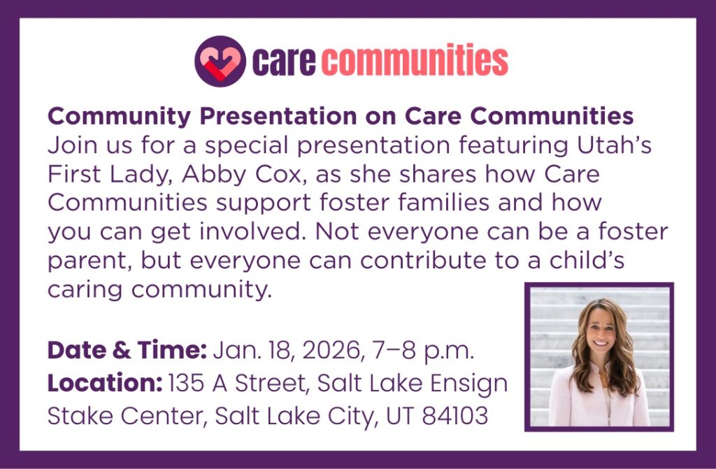 All of us living in the avenues area have been invited to a special presentation on January 18th featuring Utah’s First Lady, Abby Cox, as she shares how Care Communities support foster families and how you can get involved. Not everyone can be a foster parent, but everyone can contribute to a child’s caring community.