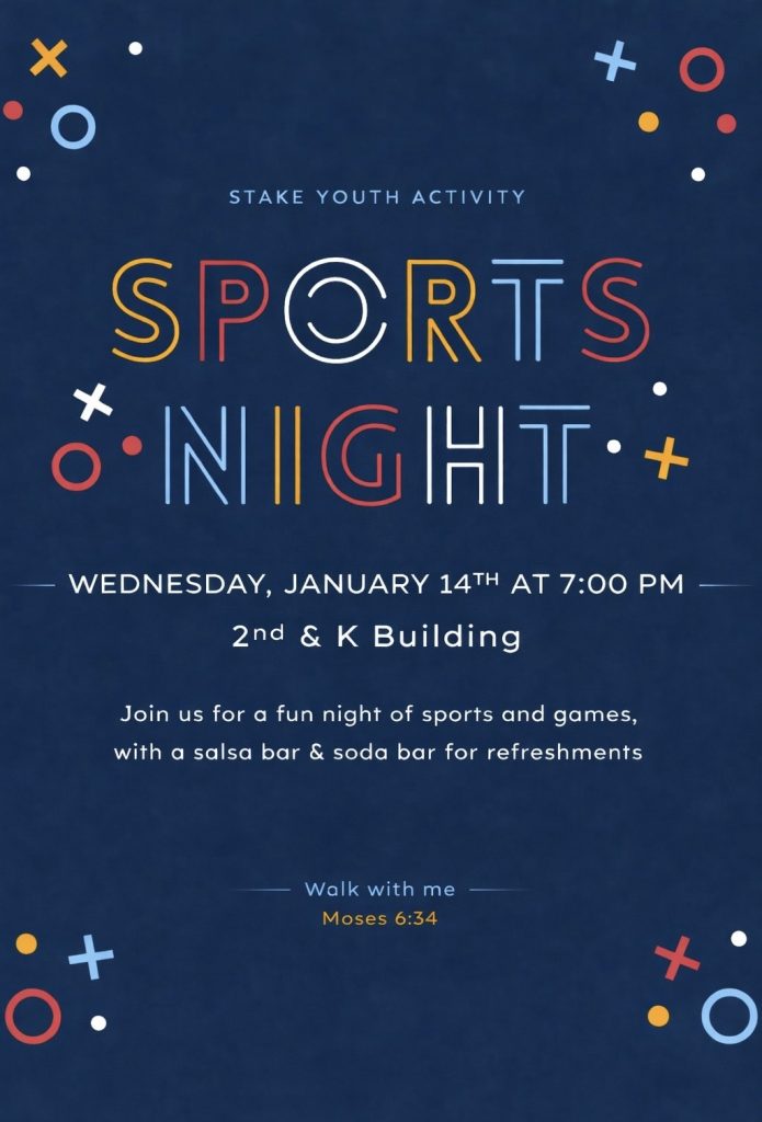 All youth in the Emigration Stake are invited to come have a great time at Sports Night on Wednesday, January 14th at 7pm (2nd and K Building).
